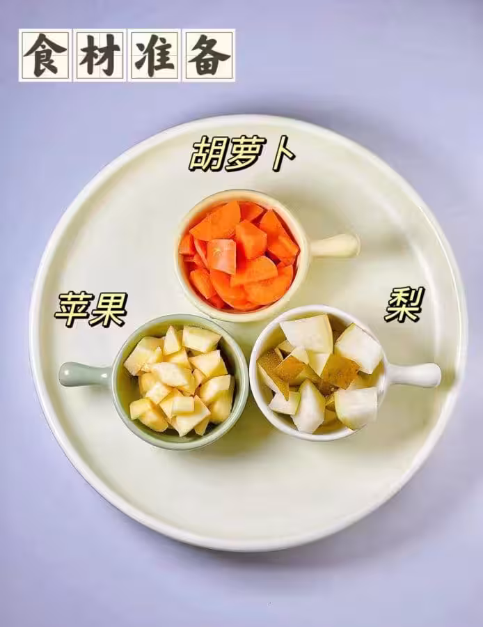 1. 胡蘿蔔洗乾淨,切成長條(別太細,免得煮爛);蘋果和梨洗凈去核,切成大塊(保留果皮,塊大一點煮好還有果肉吃);