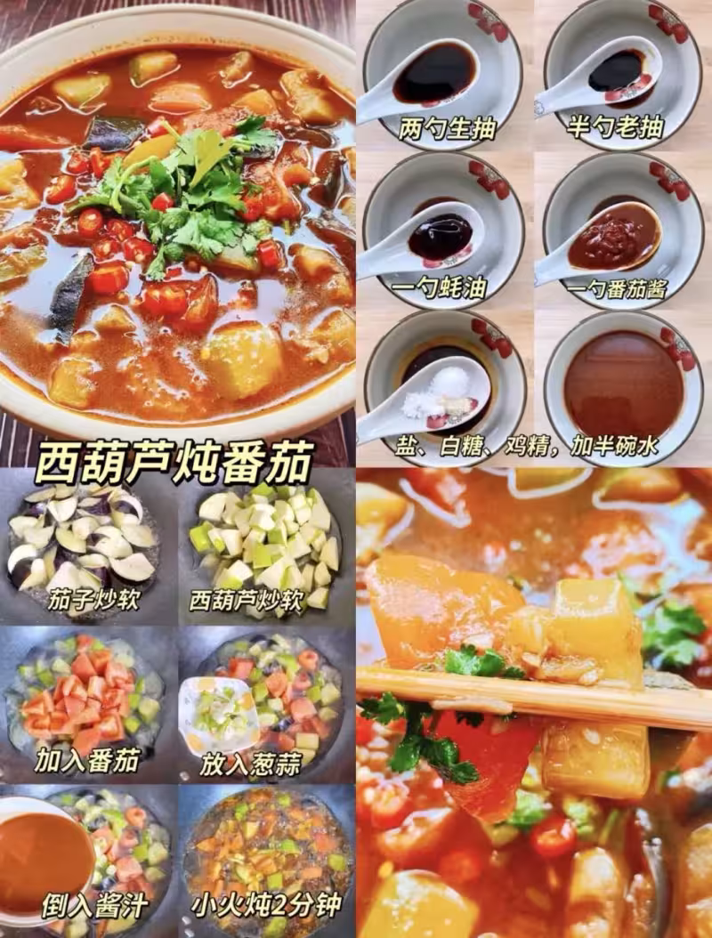 先把茄子和西葫蘆炒到軟乎乎,裹著番茄的酸甜勁兒慢慢煨,再淋上用生抽、老抽、蚝油和番茄醬調的醬汁,咕嘟咕嘟的香氣里,滿是家常的溫柔。最後撒一把翠綠的香菜,紅亮的湯汁裹著軟嫩的蔬菜,每一口都是酸甜鮮香的治癒感,像把夏天的陽光和秋天的溫柔都燉進了碗里,暖到胃裡也暖到心裡~