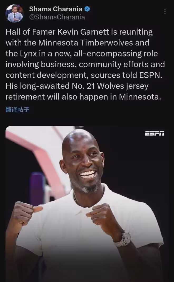 爆料王Shams:加內特重返森林狼,擔任一個全新角色,涉及商業運營、社區活動和內容開發等活動,並且他的21號球衣將在明尼蘇達舉行退役儀式。