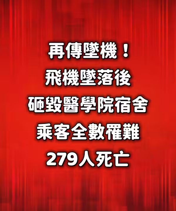 再傳墜機!飛機墜落後, 砸毀醫學院宿舍,乘客全數罹難,279人死亡!