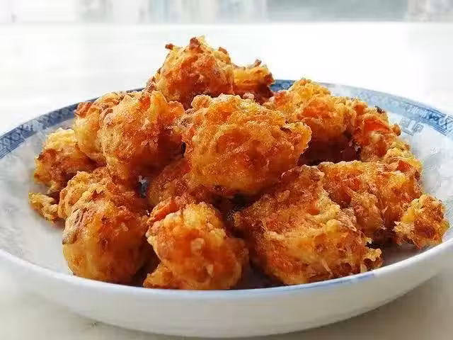 起油鍋,油溫七成熱(自己把握噢),用小勺子一勺一勺挖到鍋里炸,這樣比較快也不會弄髒手,只是不圓(喜歡圓一點就用手搓一搓再下鍋),中小火炸制,丸子完全漂浮在油上就可以出鍋了。