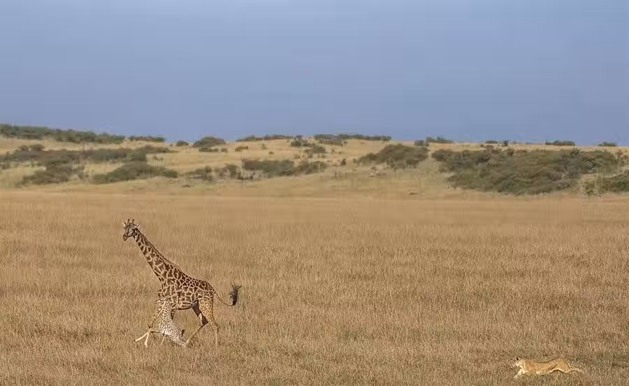 一天早晨,我們看著到一頭大長頸鹿和一隻小鹿在草原上漫遊,當母獅盯上長頸鹿母子,狩獵速度極快,沒一會就趕上了逃跑的鹿母子。