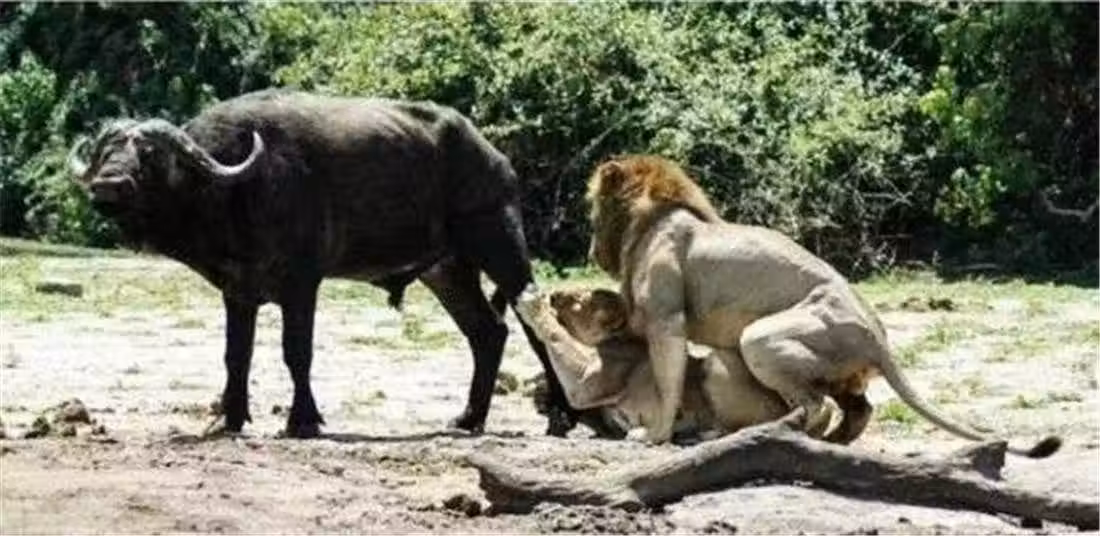 03野牛沖了過去,朝雄獅的肚子就是一陣猛戳,母獅趕過來捂死了野牛