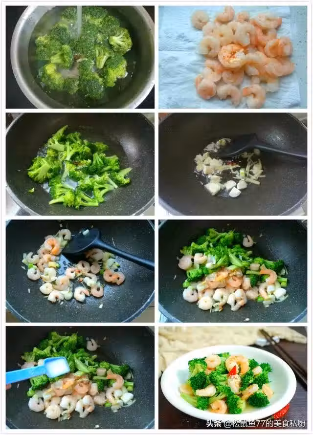 製作:先把西蘭花切成小朵,清洗乾淨。新鮮大青蝦去頭、去殼,開背去掉沙線,洗凈,用料酒、鹽腌制10分鐘後,取出來清洗乾淨,用廚房紙巾吸干水分。如果嫌麻煩,也可以超市買現成的蝦仁,這樣更省事兒一點,但是和新鮮蝦仁口感上還是差了一些。鍋中放入適量清水,大火燒開,加入1勺鹽,幾滴食用油,把西蘭花放進鍋里,焯燙2分鐘。炒鍋燒熱,倒入適量食用油,下入蔥花、薑絲煸炒出香味,放入蝦仁,翻炒兩下,加少許鹽入味,西蘭花放進去,翻炒均勻,再加入1勺鹽,再加1小勺雞粉,翻炒均勻後,加入1小勺水澱粉炒勻,出鍋裝盤,上桌就可以開吃了。