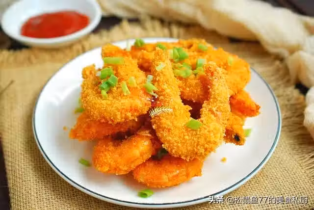 食材:中等鮮蝦200克(稍小一點也可以),食用油適量,鹽1勺,料酒2勺,姜1塊,蔥1段,雞蛋1個,玉米澱粉適量,麵包糠適量,番茄醬適量