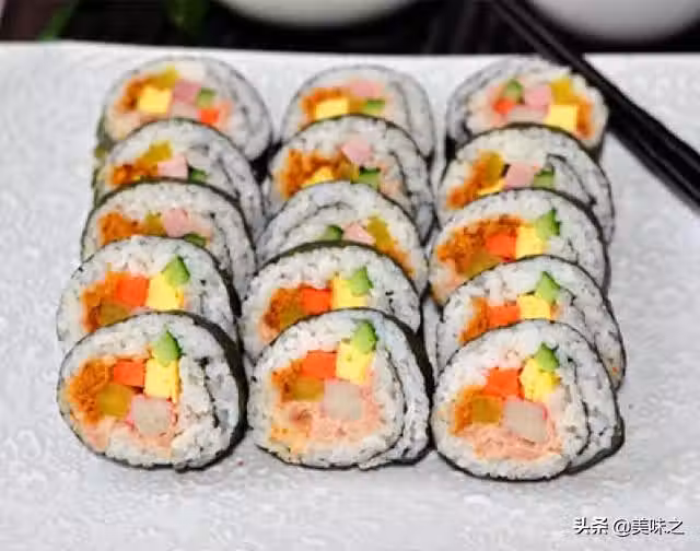 大米適量、金槍魚罐頭1罐、黃瓜適量、胡蘿蔔適量、壽司大根適量、雞蛋適量、火腿適量、肉鬆適量、蟹肉棒適量、壽司海苔適量、鹽適量、糖適量、白醋適量、蛋黃醬適量。