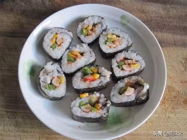 剩米飯適量、糯米飯適量、紫菜適量、四季豆適量、蟹肉棒適量、玉米適量、蝦仁適量、番茄醬適量、白醋適量、鹽適量、雞精適量。