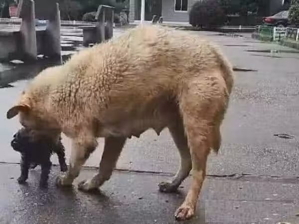 沒過多久,狗媽媽就聞到了一股孩子的氣息,沒錯,這就是自己孩子的氣息,因此狗媽一直聞著氣味尋過去,終於在路邊一個小水坑裡找到了小奶狗,它居然還活著,此時狗媽媽用頭為小奶狗擋水,好像在擁抱著它一樣,而這一幕,卻令路人看到後,感動落淚!