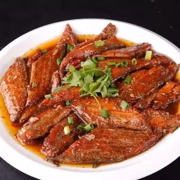 4.放入煎炸過的帶魚,倒入開水沒過魚身,續加入調味料(生抽、老抽、醋、糖、鹽和胡椒粉),以中小火燒煮入味
