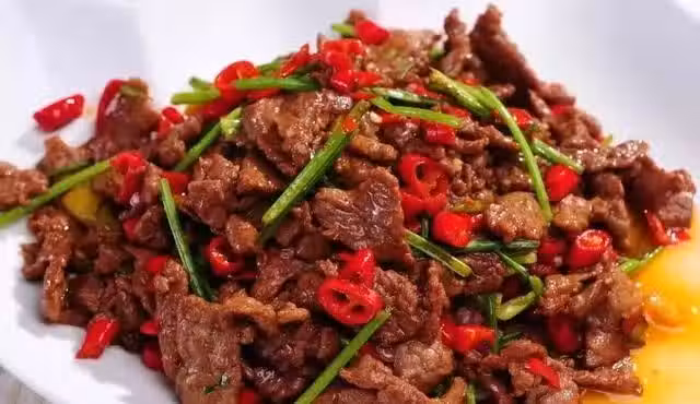 用料:牛裡脊500克、香菜梗100克、小米椒20克、雞蛋清10克、蔥10克、姜10克、青蒜15克、鹽10克、味精10克、白糖10克、蚝油10克、老抽5克、料酒20克、澱粉20克
