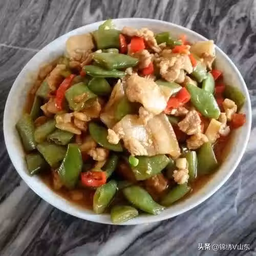 【食材】豬肉120克、扁豆150克、紅干椒4個、鹽適量、醬油1湯匙