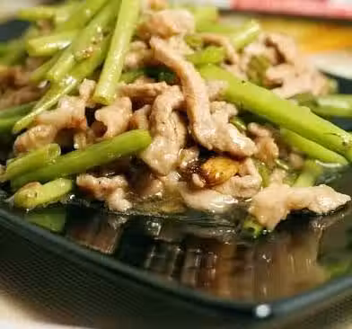 空心菜梗,裡脊肉,蒜片少許,料酒,生粉,生抽,鹽,味精。