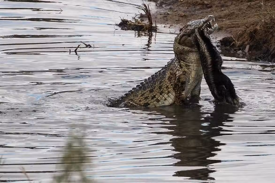 它們有時甚至會在豪豬身上碰碰運氣,拿豪豬當晚餐。在動物界的打鬥中,我們很少看到蜜獾失敗。正是由於其勇敢和無畏,它們常常能使更大的食肉動物退讓。然而,我們有句俗語,「常在河邊走,哪能不濕鞋」,今年早些時候,在南非克魯格國家公園的荒野世界中,攝影師希拉·格羅貝拉爾見到了一條尼祿鱷,它的嘴巴裡緊緊咬著一具新鮮的蜜獾。