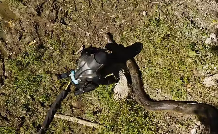 而這個時候,綠森蚺才剛吞食了羅梭裡半個頭,羅梭裡感覺到它的大口已經咬在頭盔上,能聽見有水流動的聲音和喘氣的聲音,羅梭裡的心率已經飆升到了180。這個時候羅梭裡已經堅持不住了,被迫叫停了實驗。