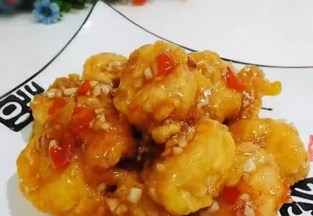 5、起熱鍋入油,五六成熱時,將蝦仁沾満滿糊下入油中,中小火炸成金黃色撈出、控油