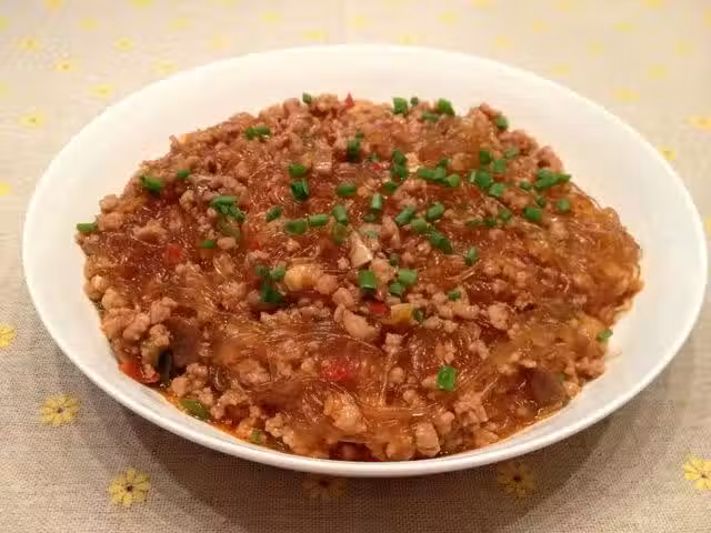 4、兌水剛好到肉末邊緣,放入粉絲;