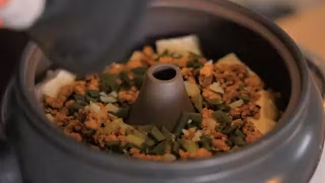 將豆腐塊放入汽鍋底部,然後澆上炒好的肉餡,再撒入蔥花(也可以臨近出鍋時撒蔥花)