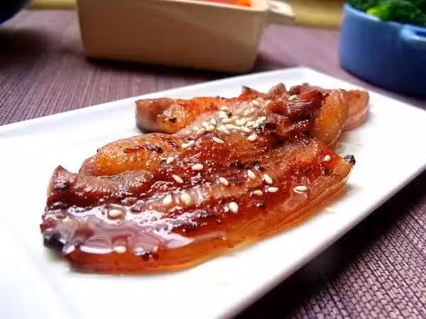五花肉切成2-3mm厚度的片,拌入腌料冷藏24小時,中途翻拌。