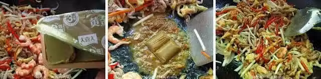 12. 咖喱塊溶化後會散出濃濃的香味,把鍋里佐料和咖喱炒勻。