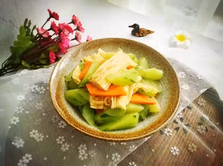 黃瓜1根,胡蘿蔔1段,腐竹兩根,鹽、香菇素蠔油適量