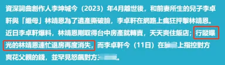 台媒曝台灣知名「爺孫戀」的女主林靖恩去世,疑死於酒店附近小巷,千萬遺產消失繼子顯心虛