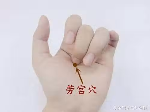勞宮穴位置:在手掌心,當第2、3掌骨之間偏於第3掌骨,握拳屈指時,位於中指和無名指指尖處。在手掌有兩條比較大的掌紋相交成「人」字形,沿中指中線向手掌方向延伸,經過「人」字相交點的下方區域,這個重合的地方即是勞宮穴。