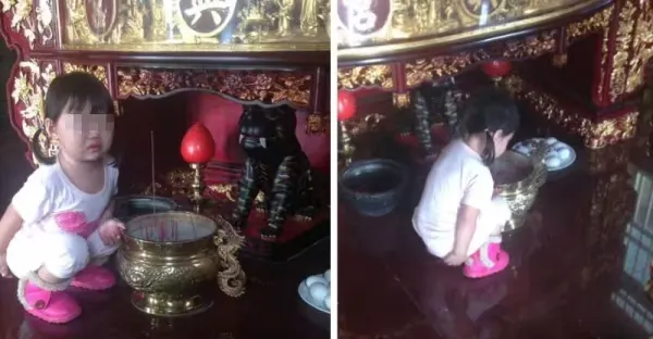 拜虎爺突然蹲下!3歲女兒「用手扶著金爐」五官全皺成團 媽媽看清後「秒腿軟下跪」:不知者無罪