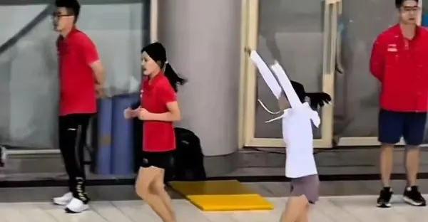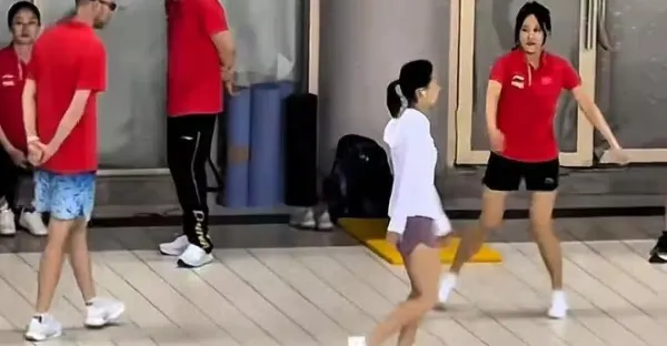 陳若琳帶領陳芋汐熱身,倆美女的身姿恰似一道亮麗的風景線