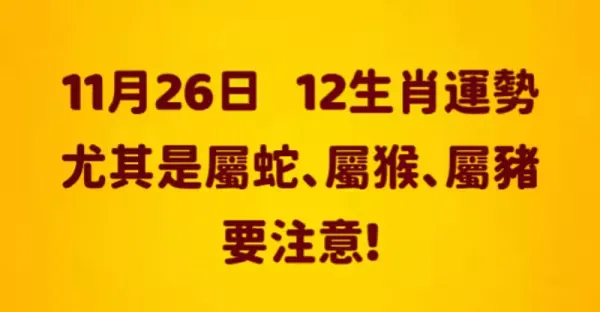 11月26日12生肖運勢 尤其是屬蛇、屬猴、屬豬要注意