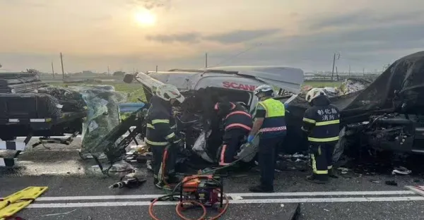 彰化聯結車猛撞停等紅燈大貨車! 車頭噴飛、駕駛受困救出