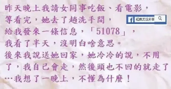 昨晚上我請美女同事吃飯,她去了趟洗手間,給我發來一條信息,「51078」,我看了半天,沒明白啥意思。