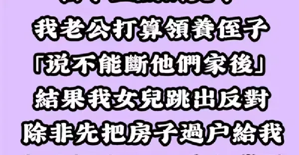 我和老公只生一個女兒,最近小叔夫妻車禍過世留下5歲兒子...我老公打算領養侄子「說不能斷他們家後」!結果我上大學的女兒跳出反對:「除非先把2間房子過戶給我!」老公氣炸了...但我卻覺得女兒說的也有道理,我現在該怎麼辦好