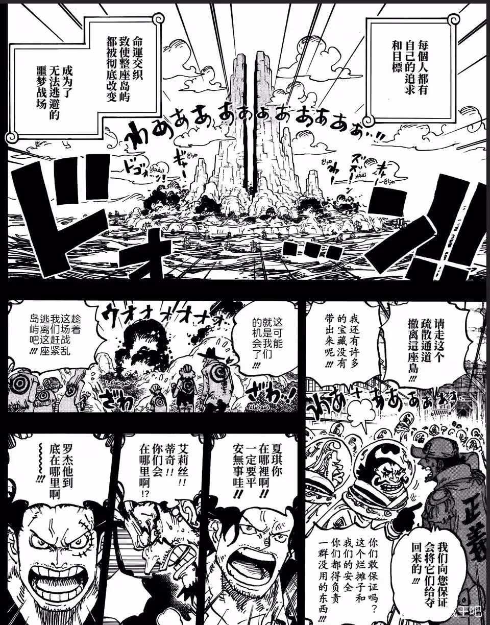 神之谷大戰徹底爆發,每個海賊都有自己的目標,天龍人也在責罰海軍,他們帶來的財寶還沒有拿走,海軍讓天龍人趕緊逃跑,財寶的話海軍會幫忙保管,不過天龍人不信。羅傑在尋找夏琪,洛克斯在尋找老婆和孩子,卡普在尋找羅傑。