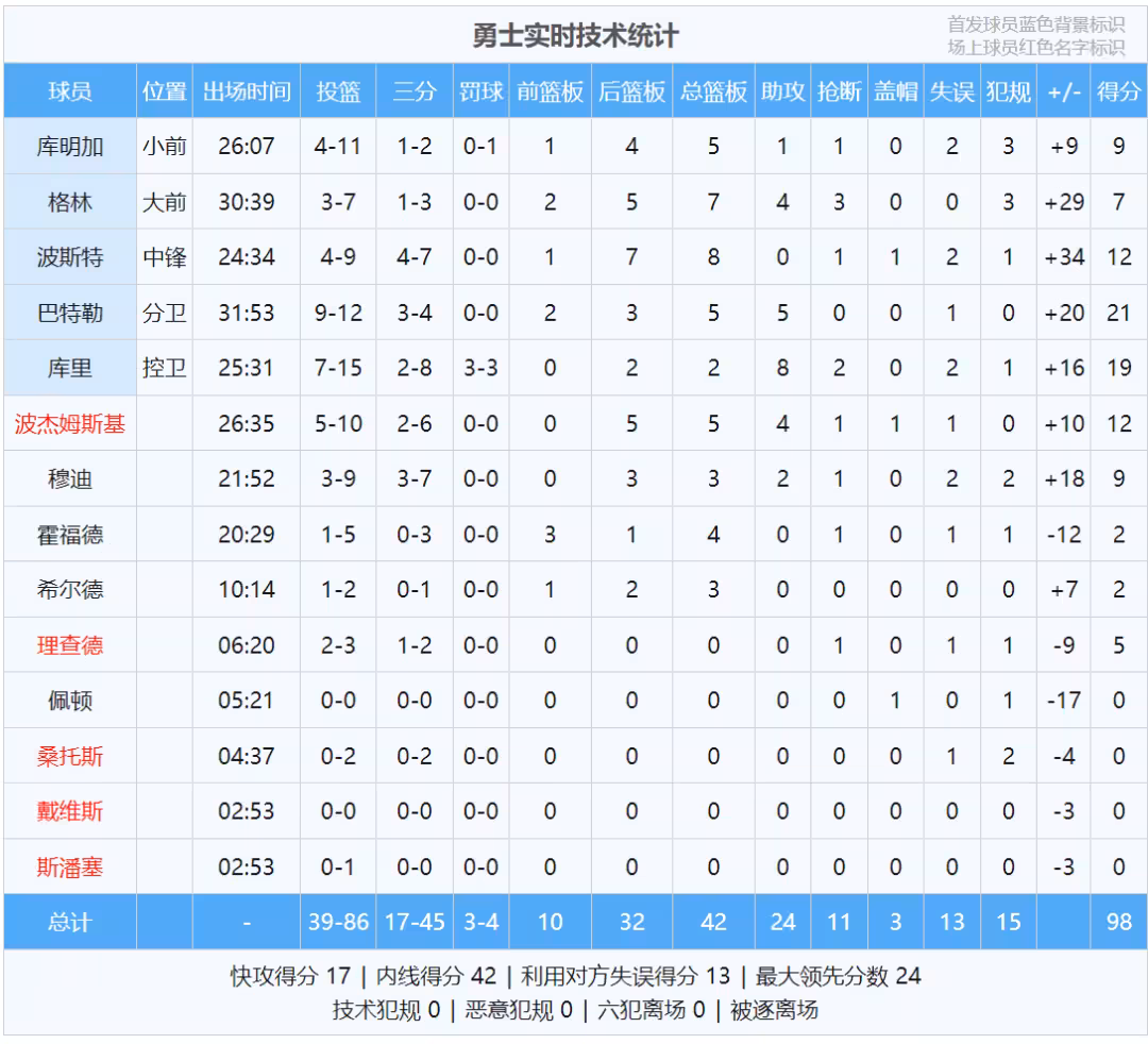 勇士首發:庫里、巴特勒、庫明加、追夢、波斯特。快船首發:哈登、博格丹、倫納德、小德里克-瓊斯、祖巴茨。祖巴茨本賽季場均16分6.7籃板3.3助攻1蓋帽2失誤,投籃命中率65.6%。得分比上賽季少了0.8分,籃板少了5.9個。