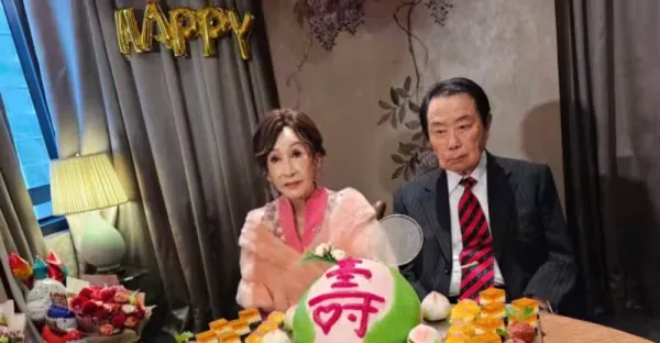 鄭明明79歲大壽三代同堂,一身粉嫩雍容華貴,丈夫罕露臉面無表情